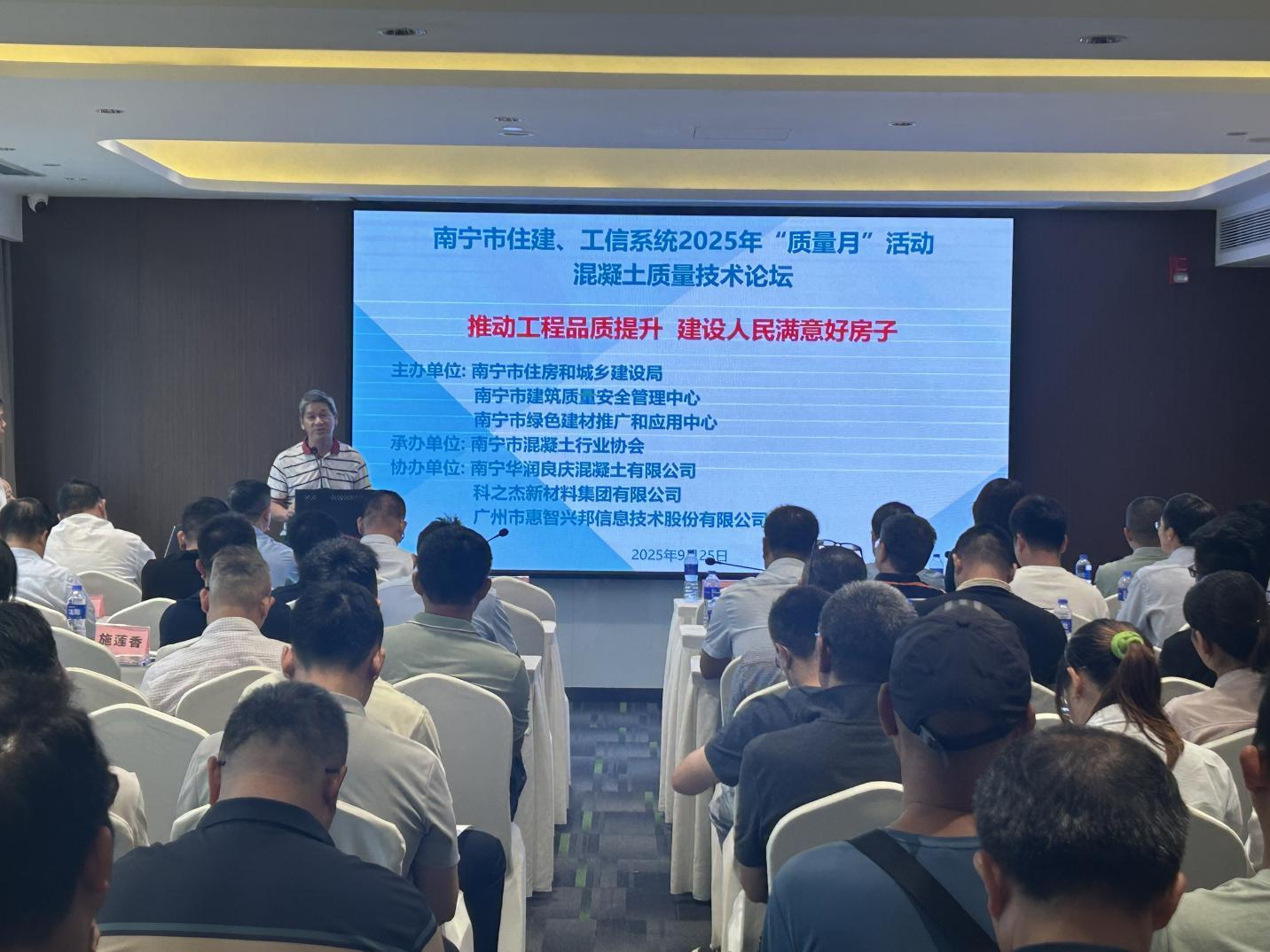 9 月 25 日,由南宁市住房和城乡建设局、南宁市建筑质量安全管理中心、南宁市绿色建材发展和应用中心主办,南宁市混凝土行业协会承办,南宁华润良庆混凝土有限公司、科之杰新材料集团有限公司、广州市惠智兴邦信息技术股份有限公司协办的南宁市住建、工信系统 2025 年“质量月”活动混凝土质量技术论坛在南宁圆满举办。